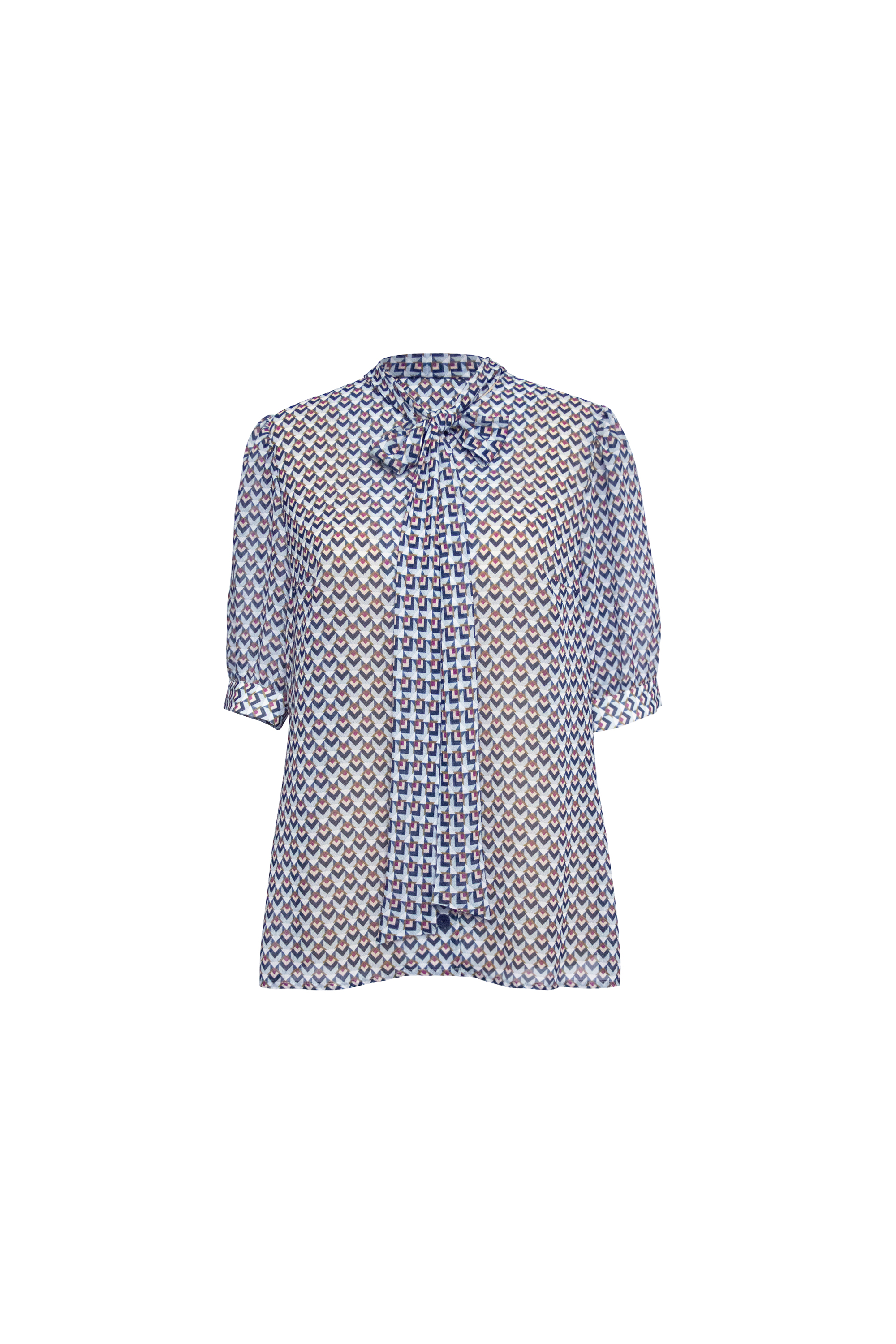 Рукава втачные, одношовные, короткие, окат рукава присборен, разрез рукава окантован, с притачной манжетой, манжет рукава застегивается на петлю и пуговицу. Горловина переда и спинки круглая с воротником стойкой переходящим в бант.