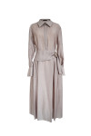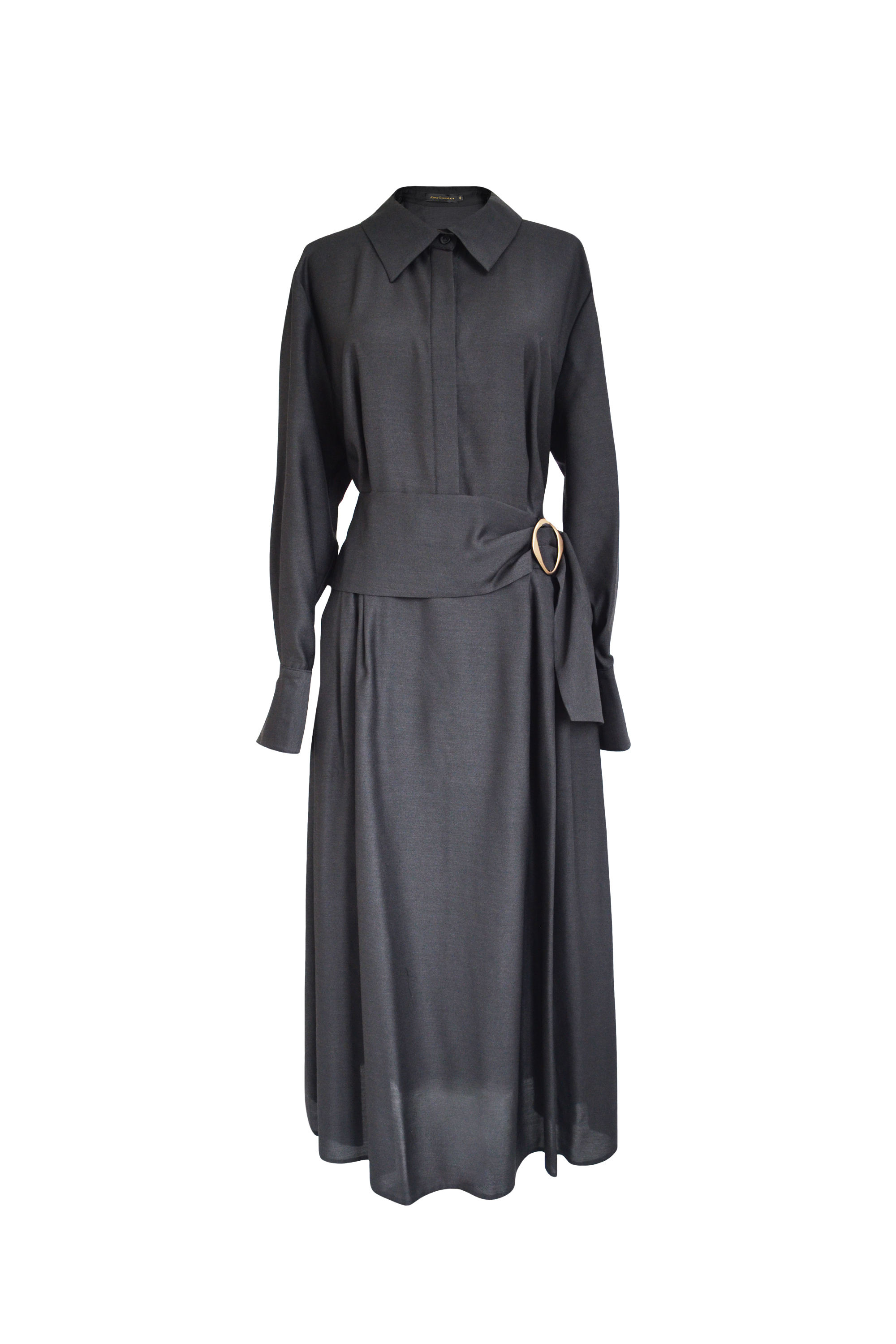 Платье женское, из плательной ткани, полуприлегающего силуэта, отрезное по линии талии, с поясом, с застежкой на потайную молнию, расположенную в боковом шве. Верхняя часть переда с односторонними складками, сгиб которых направлен к боковому шву, потайной цельнокроенной планкой, планка застегивается на пять петель и пуговиц. Перед с двумя полупоясами, вставленными в боковые швы втачного пояса, правый полупояс с односторонними складками, на левый закреплена пряжка. Верхняя часть спинки и нижняя часть переда и спинки с односторонними складками, сгиб которых направлен к боковому шву. Рукава длинные, с односторонними складками, разрез рукава с притачной планкой. Рукава с притачной манжетой, манжет рукава застегивается на две петли и пуговицы. Воротник отложной с отрезной стойкой, стойка с застежкой на петлю и пуговицу. Платье на подкладке.
