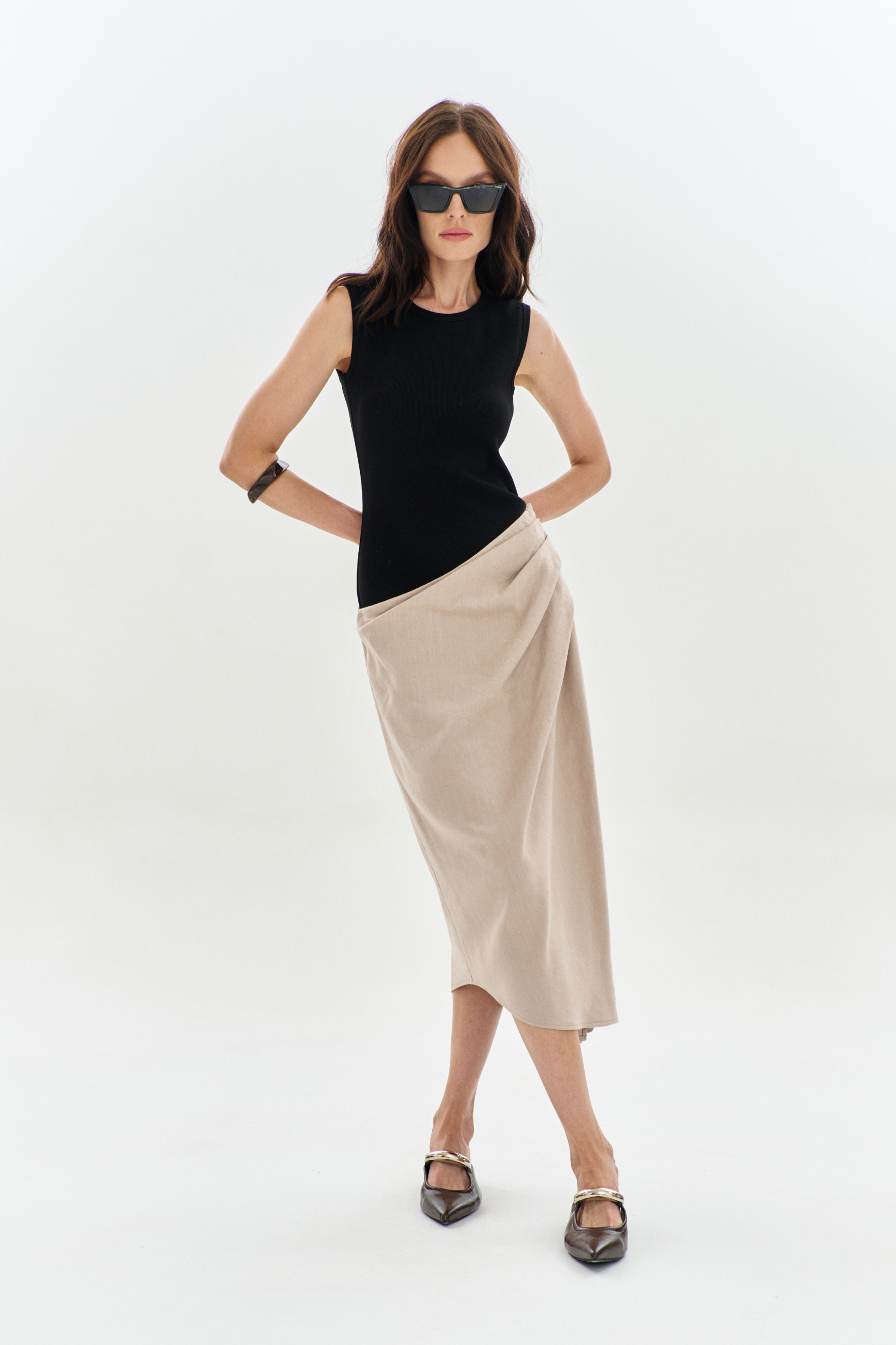 Платье женское, двух предметное состоит из платья и юбки. Платье – из трикотажного полотна прилегающего силуэта. Юбка - из льняной ткани.