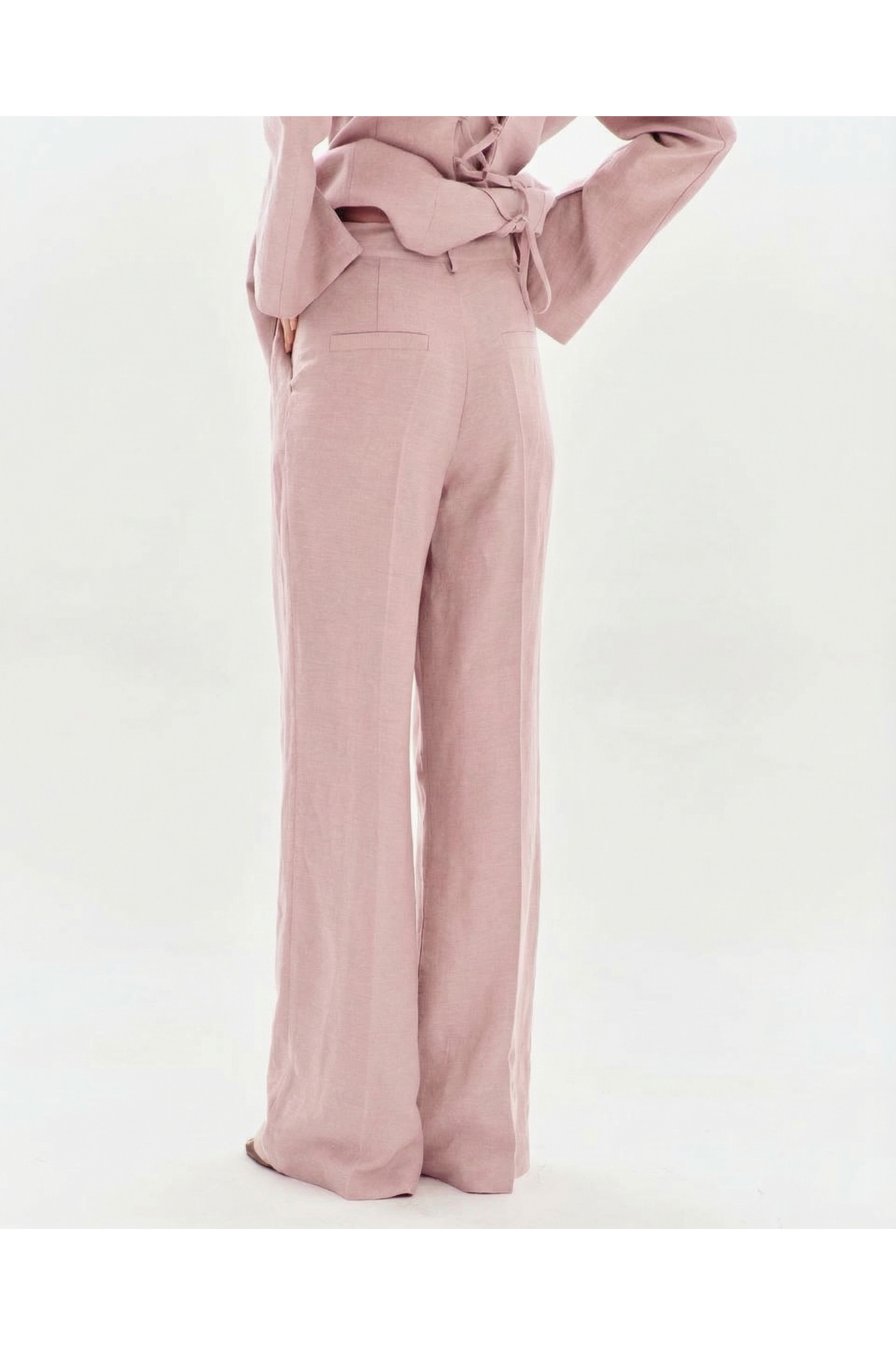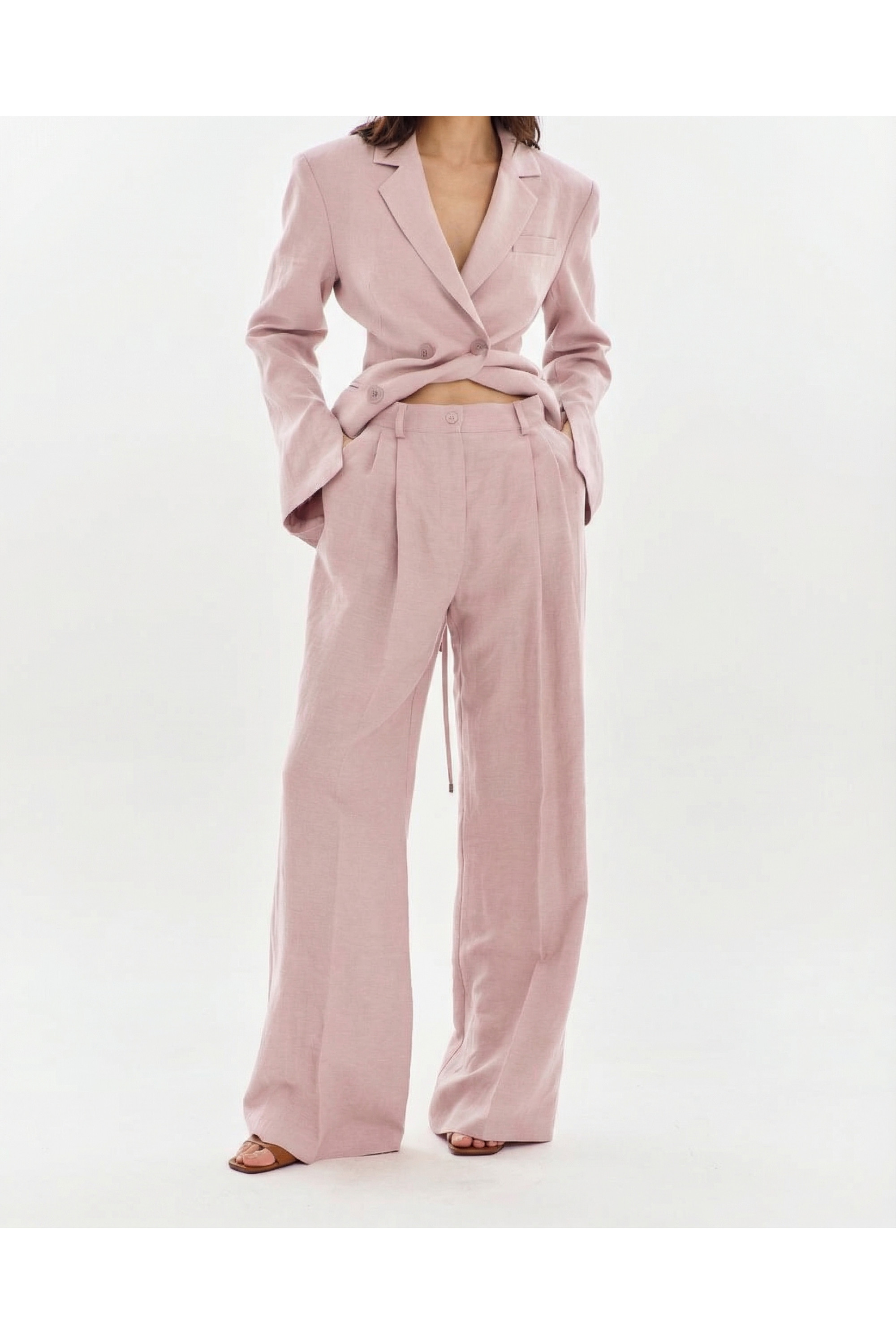 Брюки женские из льняной ткани, прямые, на поясе. Застежка брюк на молнию, петлю и пуговицу по концам пояса, пояс пятью шлевками. Передние части брюк с заутюженными кантами, односторонними складками, сгиб которых направлен к боковому шву, с боковыми карманами, обработанными в швах отрезных бочков. Задние части брюк с талиевыми вытачками, заутюженными кантами, прорезными карманами с листочкой с втачными концами.
