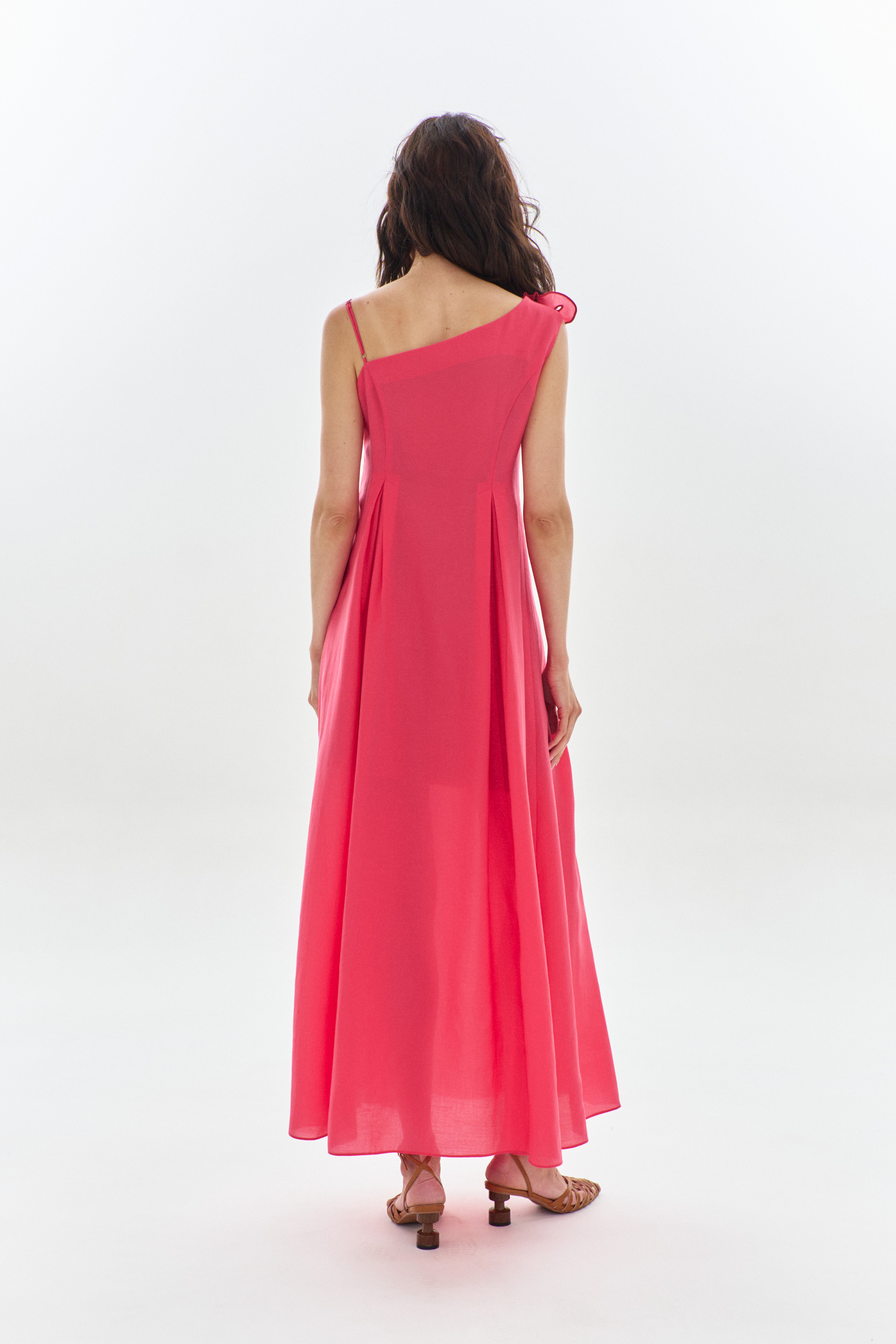 Платье женское, из плательной ткани, полуприлегающего силуэта, ассиметричное, с регулирующийся бретелью с левой стороны. С застежкой на потайную молнию, расположенную в боковом шве.