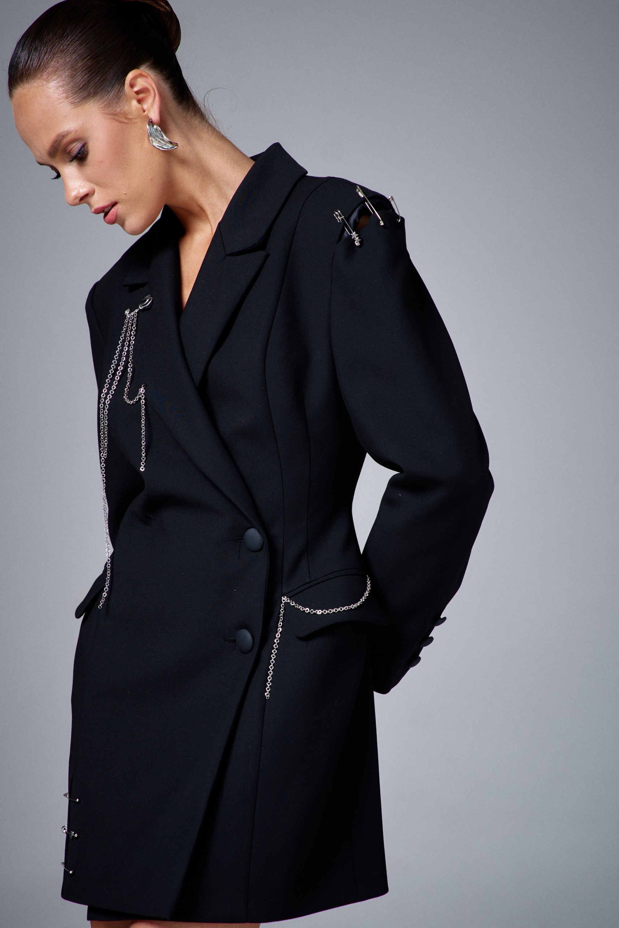 Воротник отложной с отворотами из подбортов. На разрез рельефного шва и левый рукав застегнуто по три декоративных булавки. Жакет на подкладке с плечевыми накладками. Правый лацкан с декоративной брошью-булавкой, булавка с металлическими цепочками.