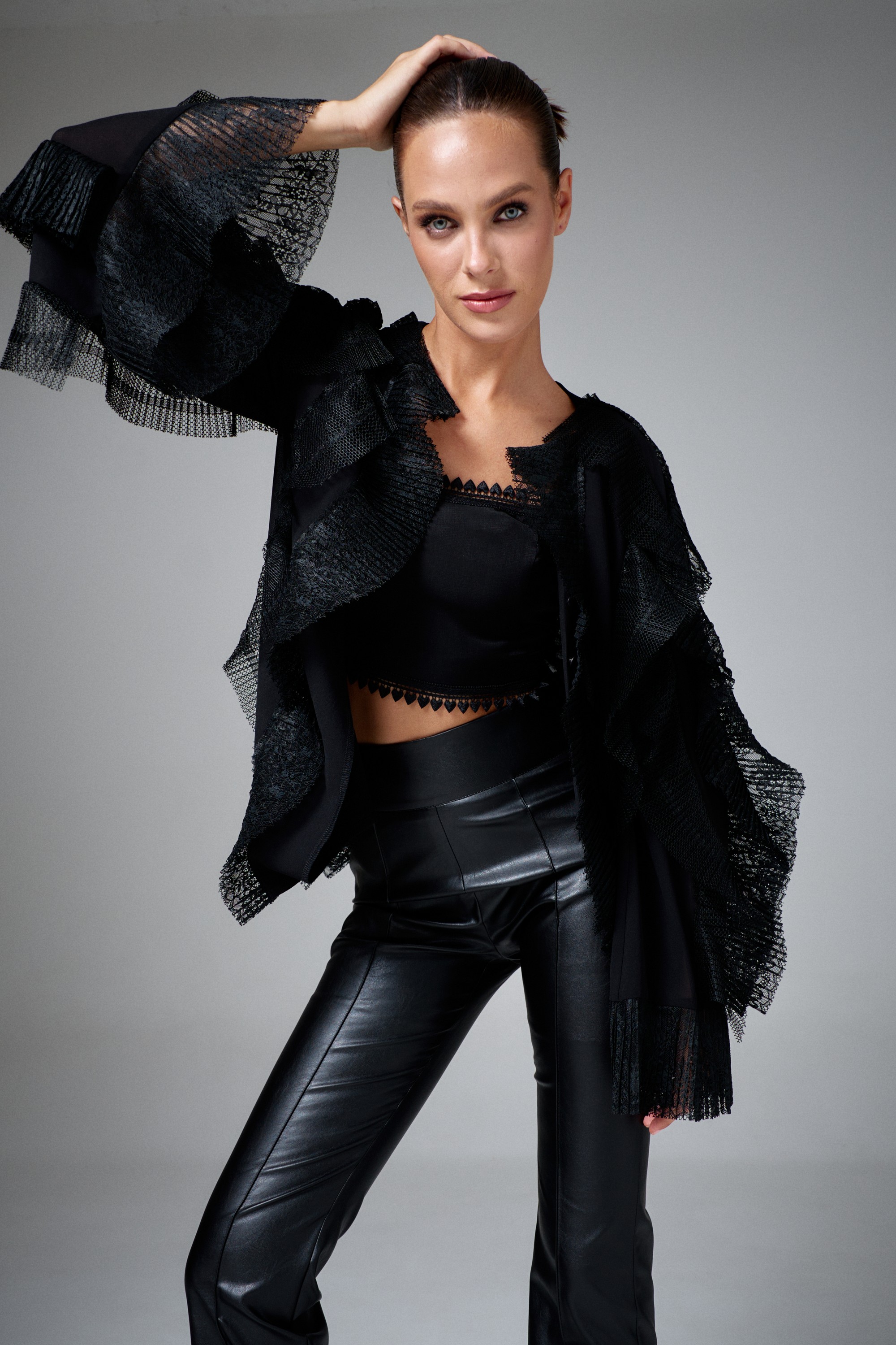 Перед с нагрудными вытачками от шва втачивания рукавов в пройму, с двумя настроченными воланами. На спинку настрочено четыре волана. Воланы на перед и спинку настрочены вертикально.