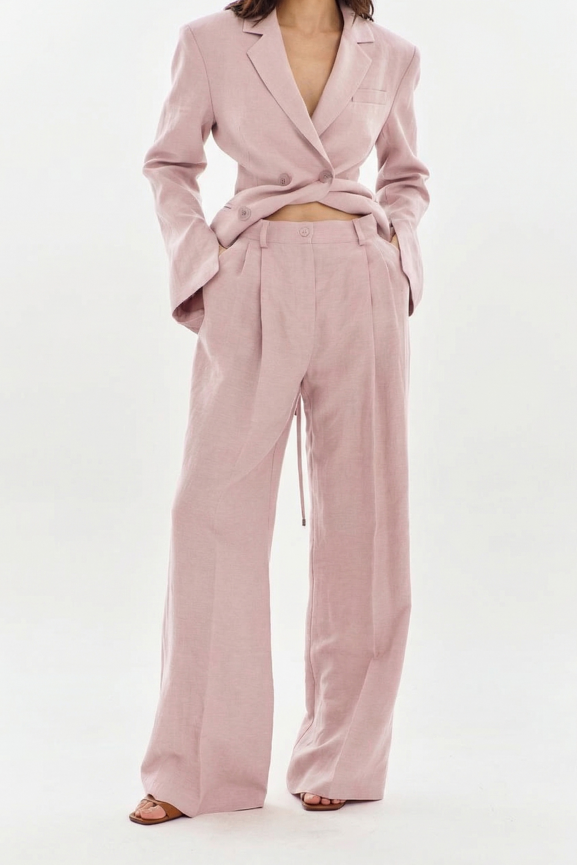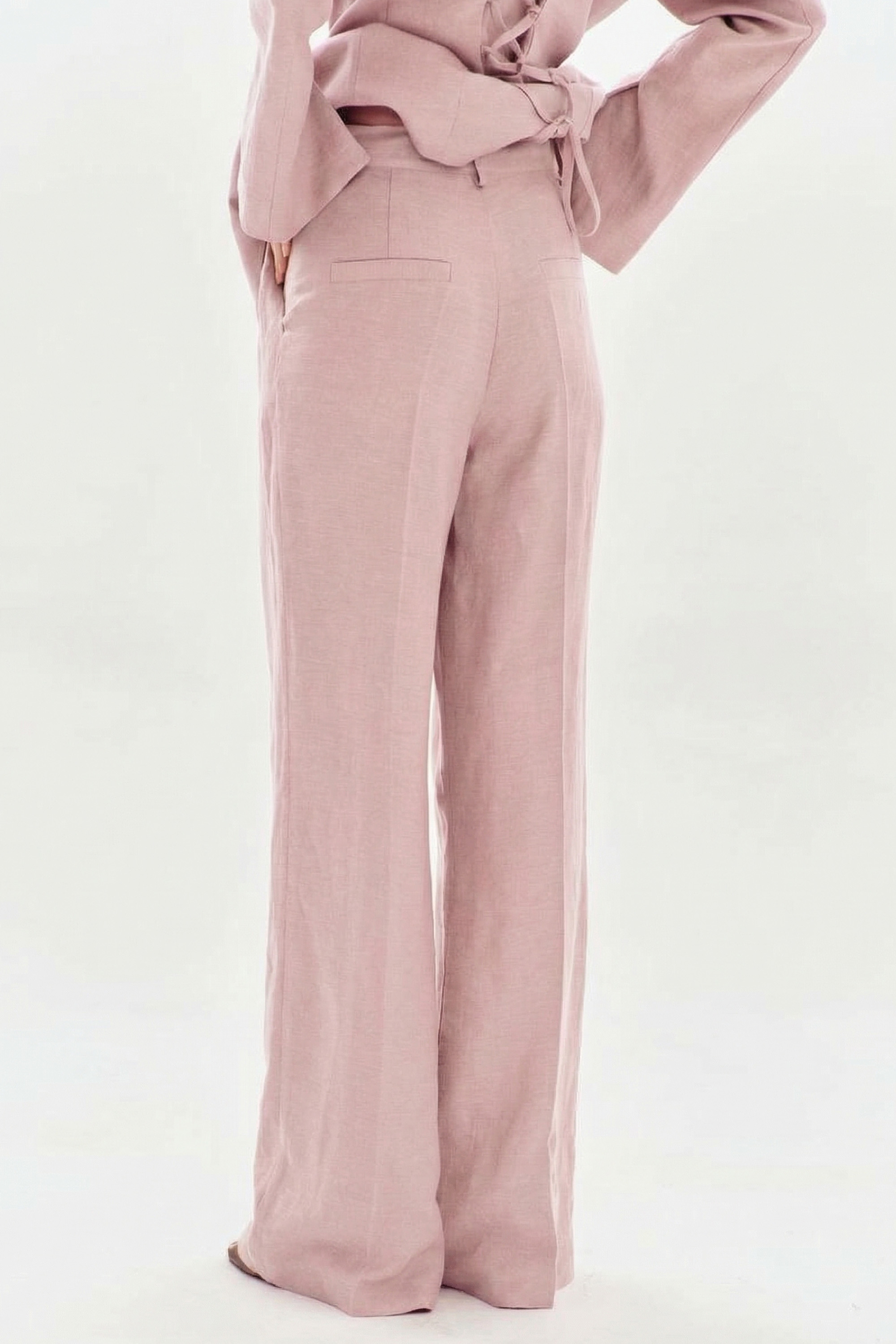 Брюки женские из льняной ткани, прямые, на поясе. Застежка брюк на молнию, петлю и пуговицу по концам пояса, пояс пятью шлевками. Передние части брюк с заутюженными кантами, односторонними складками, сгиб которых направлен к боковому шву, с боковыми карманами, обработанными в швах отрезных бочков. Задние части брюк с талиевыми вытачками, заутюженными кантами, прорезными карманами с листочкой с втачными концами.