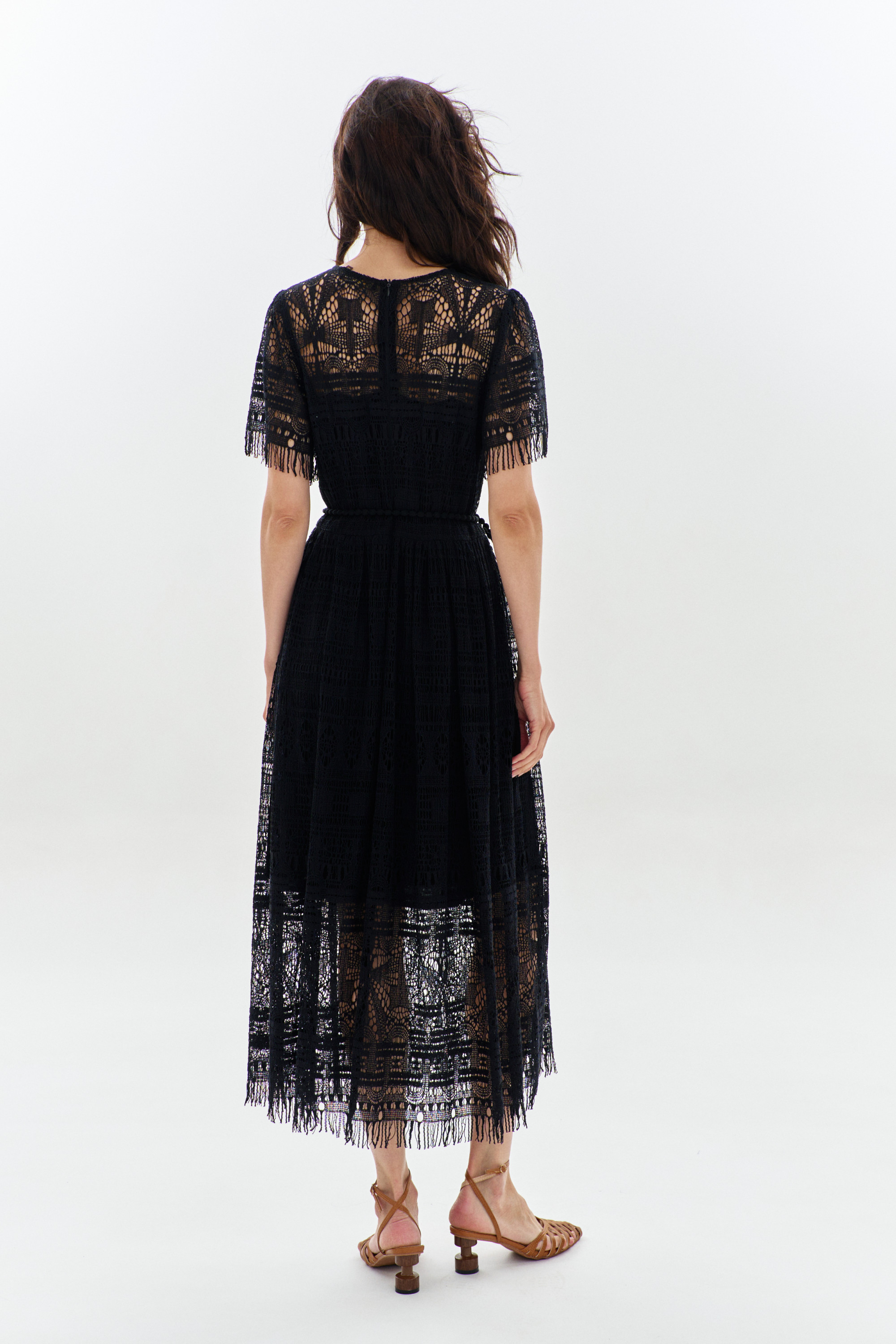 Платье женское, из кружевной ткани, полуприлегающего силуэта, отрезное по линии талии, с застежкой на потайную молнию, расположенную в среднем шве спинки платья.